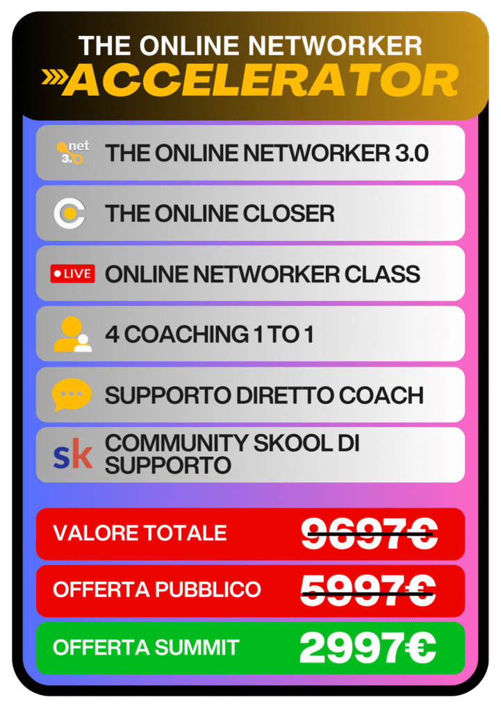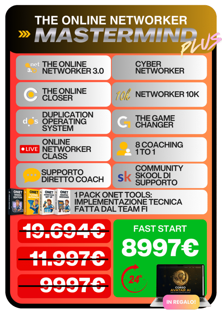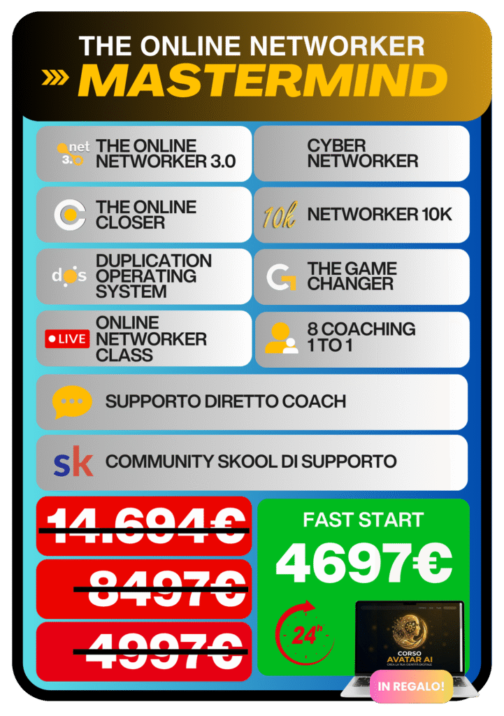 Ed è esattamente ciò che insegniamo dentro l’Online Networker University, la prima scuola in Italia che forma i networker con strategie digitali avanzate, capaci di moltiplicare i risultati senza più rincorrere nessuno.
